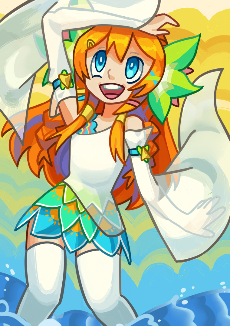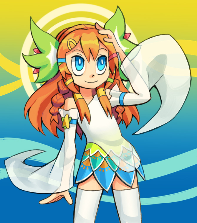 A bright, youthful-looking girl with clear blue eyes and braided red hair. A seemingly inexhaustible reserve of cheer fuels her as she bounds around everywhere. Fragrant lotus petals weave though her hair, and colourful cowrie-shell accessories clatter about her ankles and wrists.